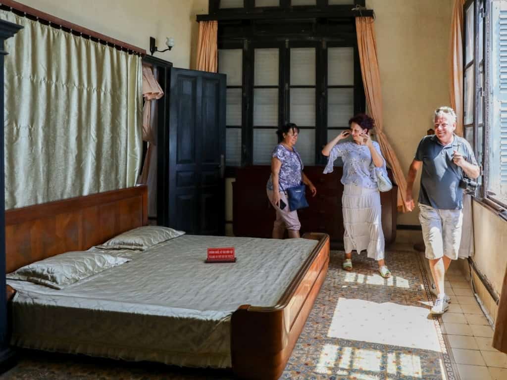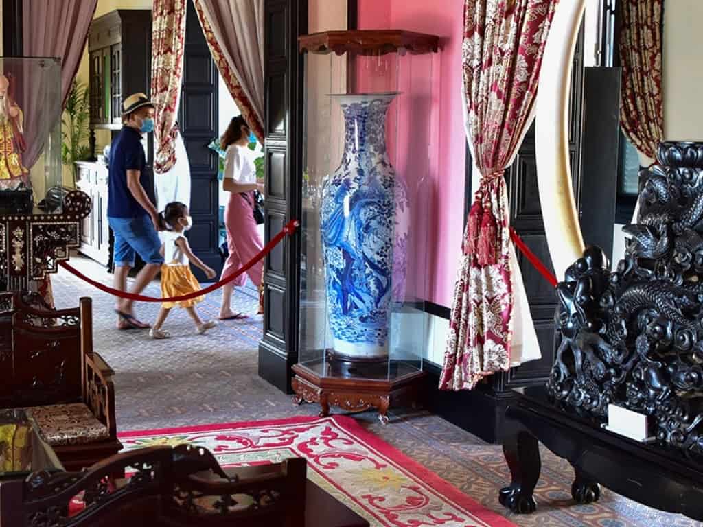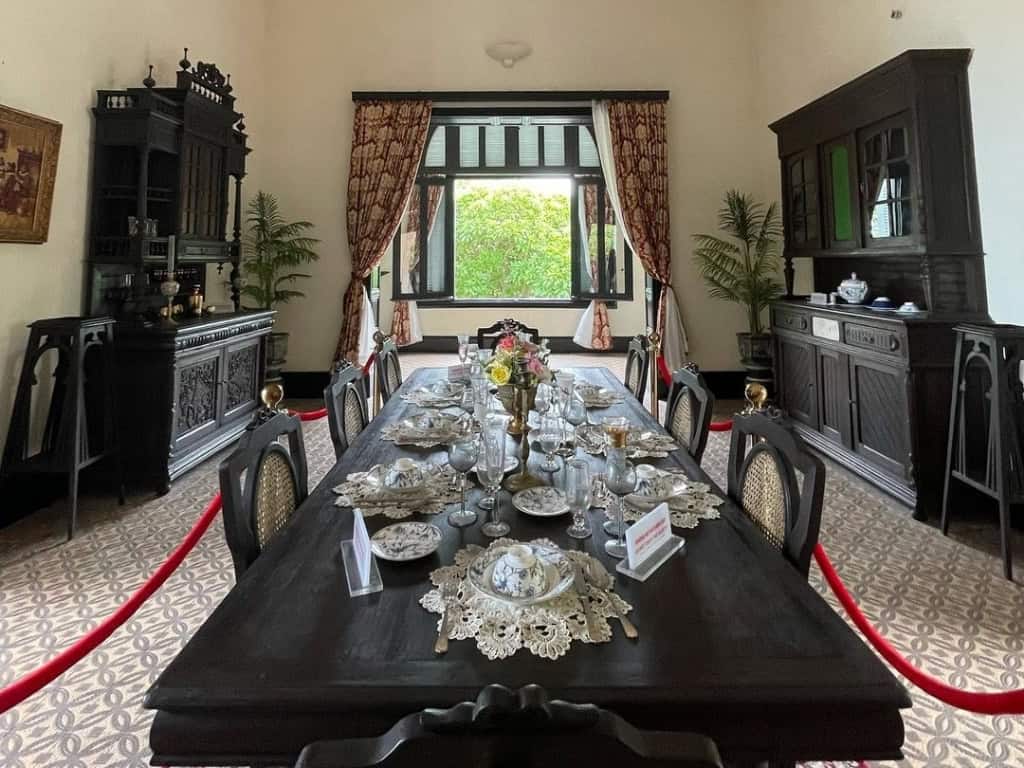 Bước vào không gian bên trong, du khách sẽ được chiêm ngưỡng những hiện vật cổ có giá trị lịch sử hơn trăm năm, vẫn được gìn giữ nguyên vẹn qua thời gian. Những bộ bàn ghế gỗ sang trọng, sáng bóng với hoa văn điêu khắc tinh xảo, cùng bộ tam đa Phúc – Lộc – Thọ thể hiện phong cách vương giả, đậm nét nghệ thuật. Ngoài ra, nơi đây còn sở hữu cặp ngà voi Châu Phi, hai chiếc bình Bách Điểu Chầu Phụng quý hiếm, tượng trưng cho sự quyền uy và phú quý.