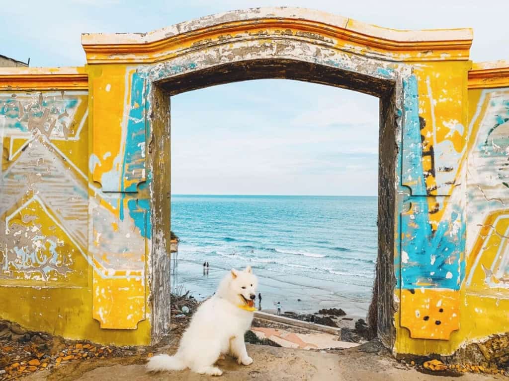 Điểm dừng chân tiếp theo chính là cánh cổng nổi bật với sắc vàng tươi rực rỡ đặc trưng. Dù bức tường này đã có chút cũ kỹ nhưng chính sự kết hợp giữa màu vàng nghệ và những đốm xanh đã tạo nên một nét nghệ thuật độc đáo. Cánh cổng này được ví như một cánh cửa thần kỳ mở ra đại dương bao la. Đứng tại đây, bạn sẽ có được những bức ảnh ấn tượng, thu hút mọi ánh nhìn.