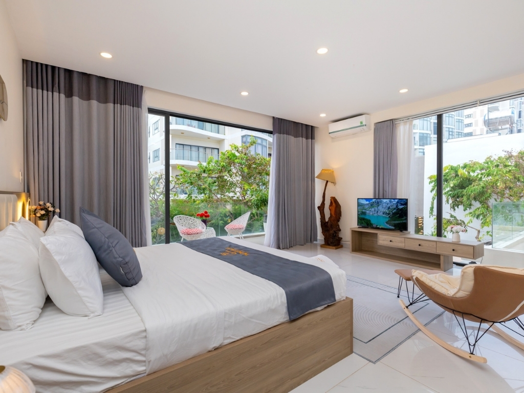 Phòng Deluxe có diện tích khoảng 25m², phù hợp cho cặp đôi hoặc gia đình nhỏ (2 người lớn + 1 trẻ em dưới 6 tuổi). Phòng được trang bị giường lớn, điều hòa, TV, minibar, wifi tốc độ cao và phòng tắm riêng. Điểm nhấn là cửa kính lớn đón nắng, view hướng vườn hoặc biển, tạo cảm giác gần gũi thiên nhiên.