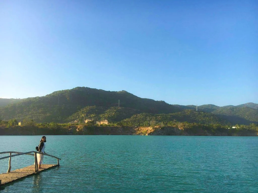 Cách resort khoảng 20km, Hồ Đá Xanh nổi bật với làn nước trong xanh và cảnh núi non hùng vĩ bao quanh. Giữa hồ có cây cầu nhỏ dẫn ra sát mặt nước, tạo nên khung cảnh thơ mộng, là điểm check-in “sống ảo” được nhiều bạn trẻ yêu thích.