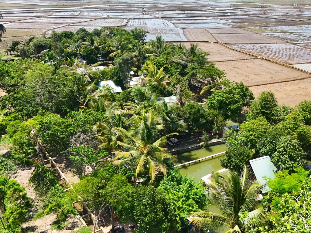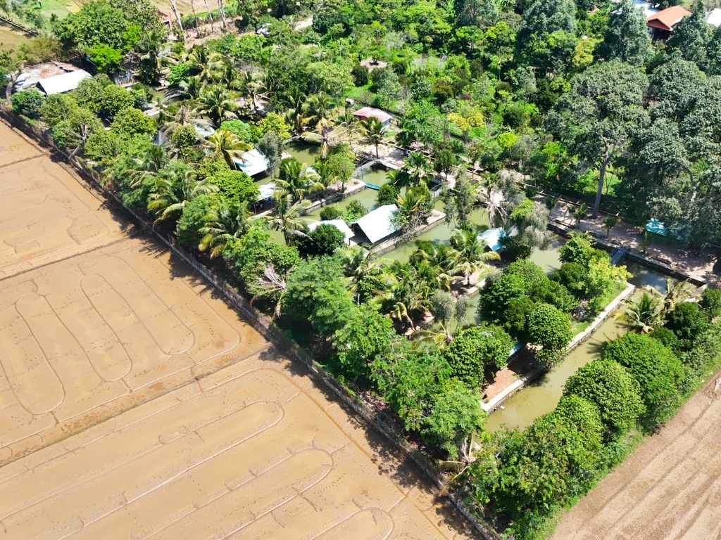 Dù nằm ở một tỉnh ven biển, nhưng toàn bộ cảnh quan lại mang đúng tinh thần miền Tây: ao nước xanh, cầu khỉ, chòi lá, xuồng nhỏ và những cánh đồng lúa trải dài ba phía.